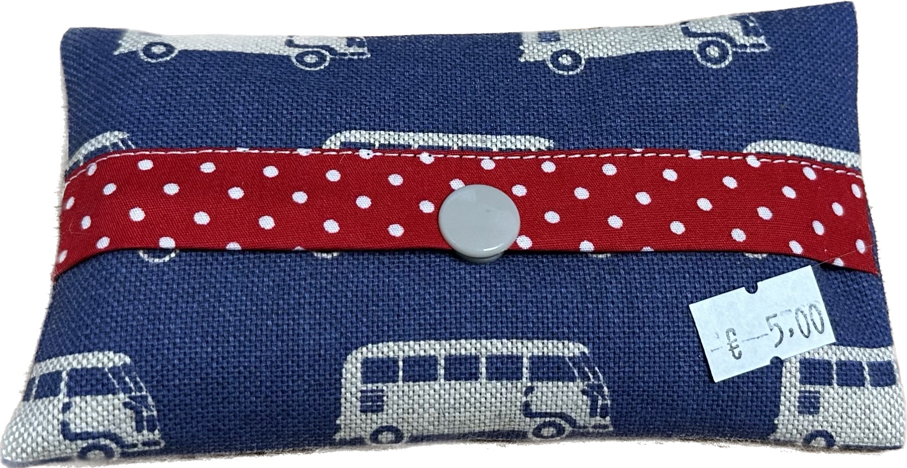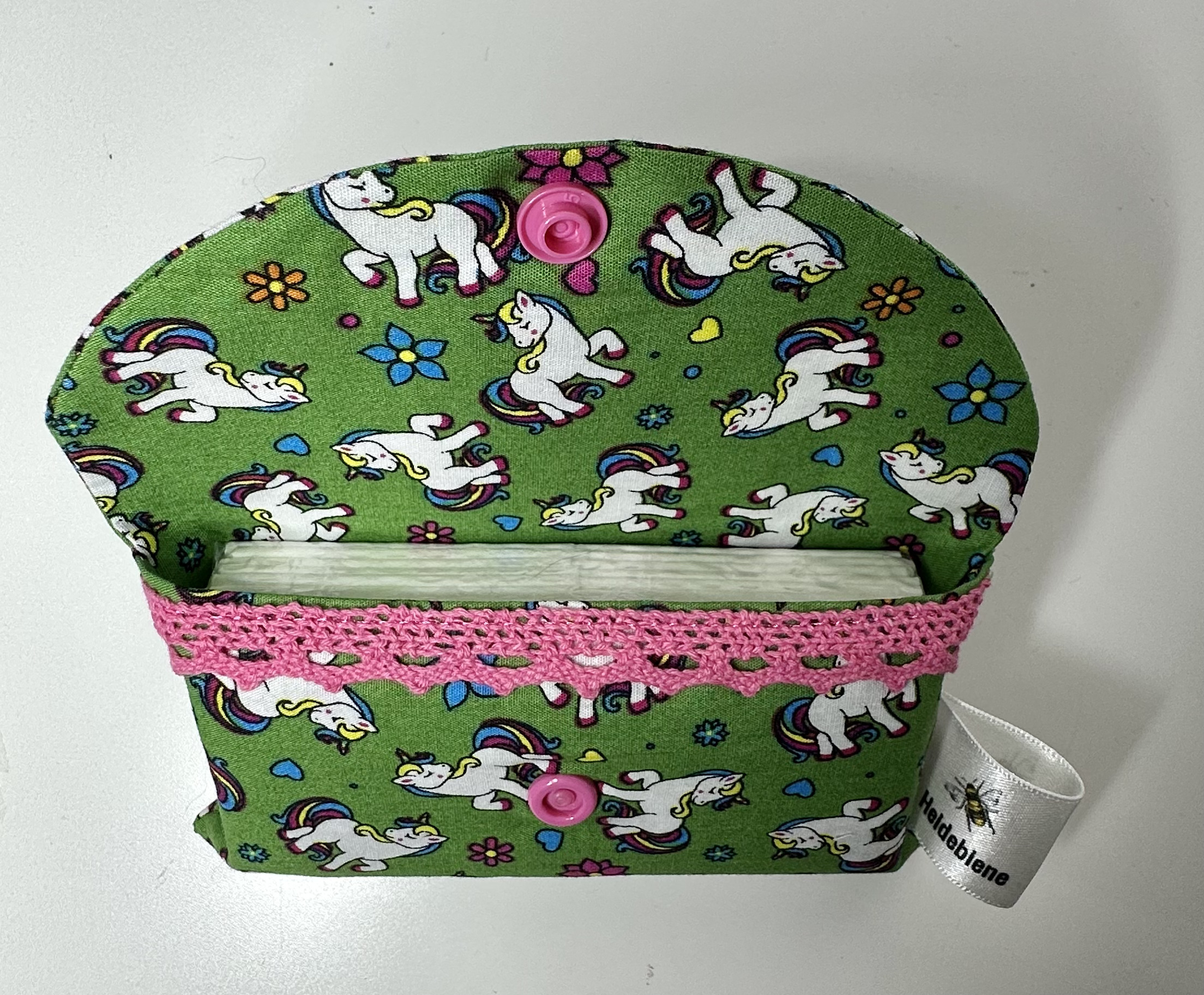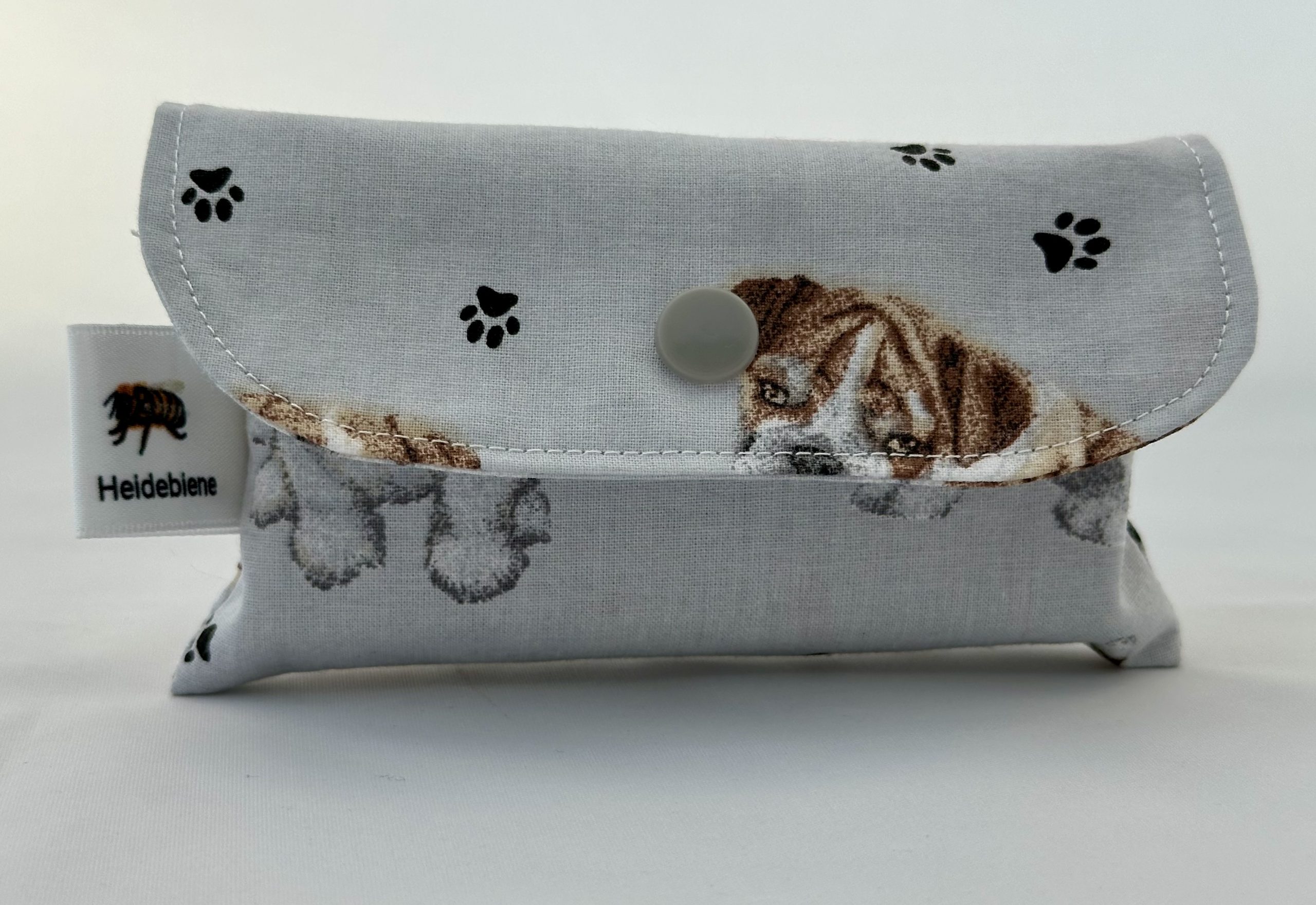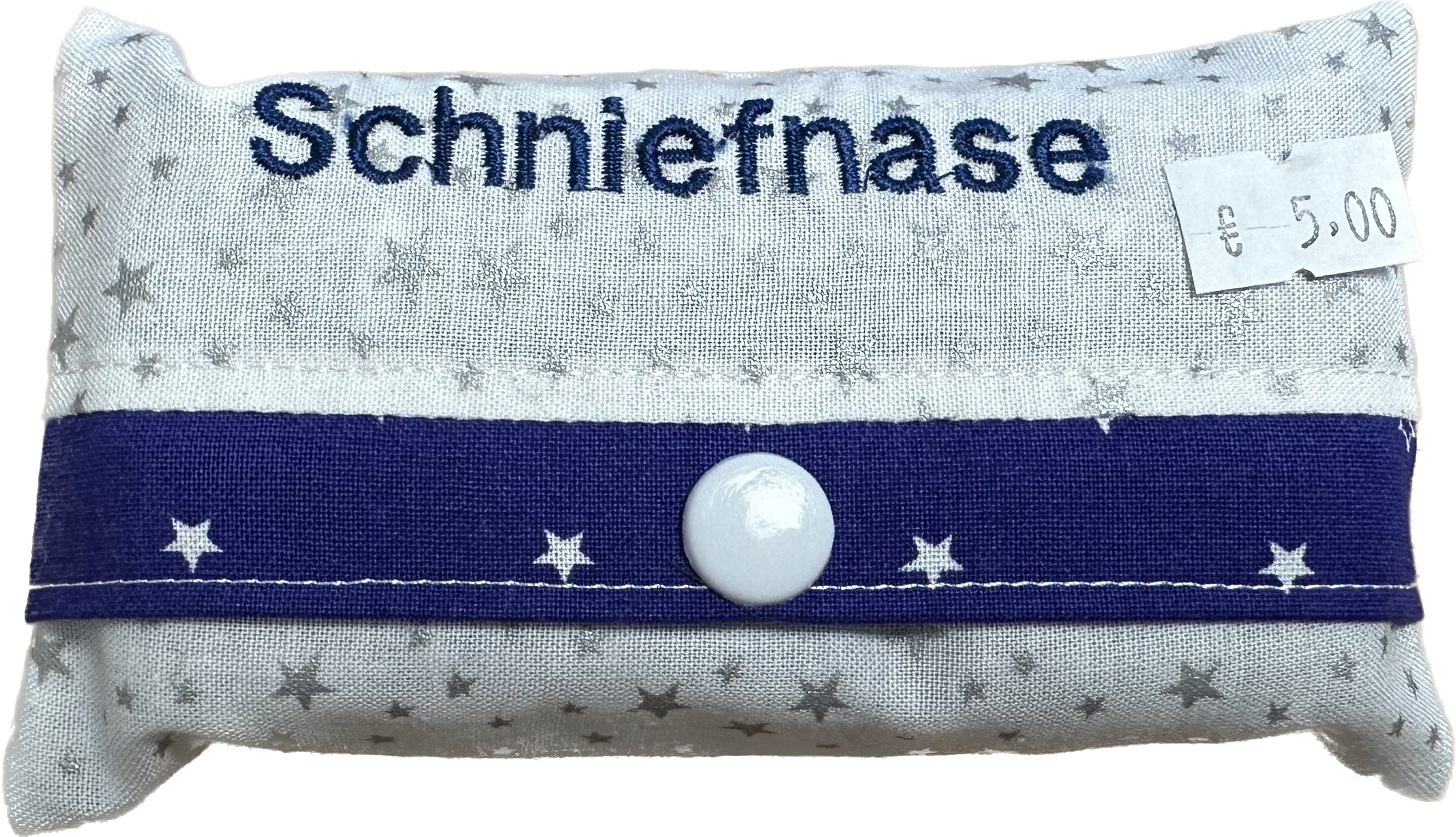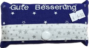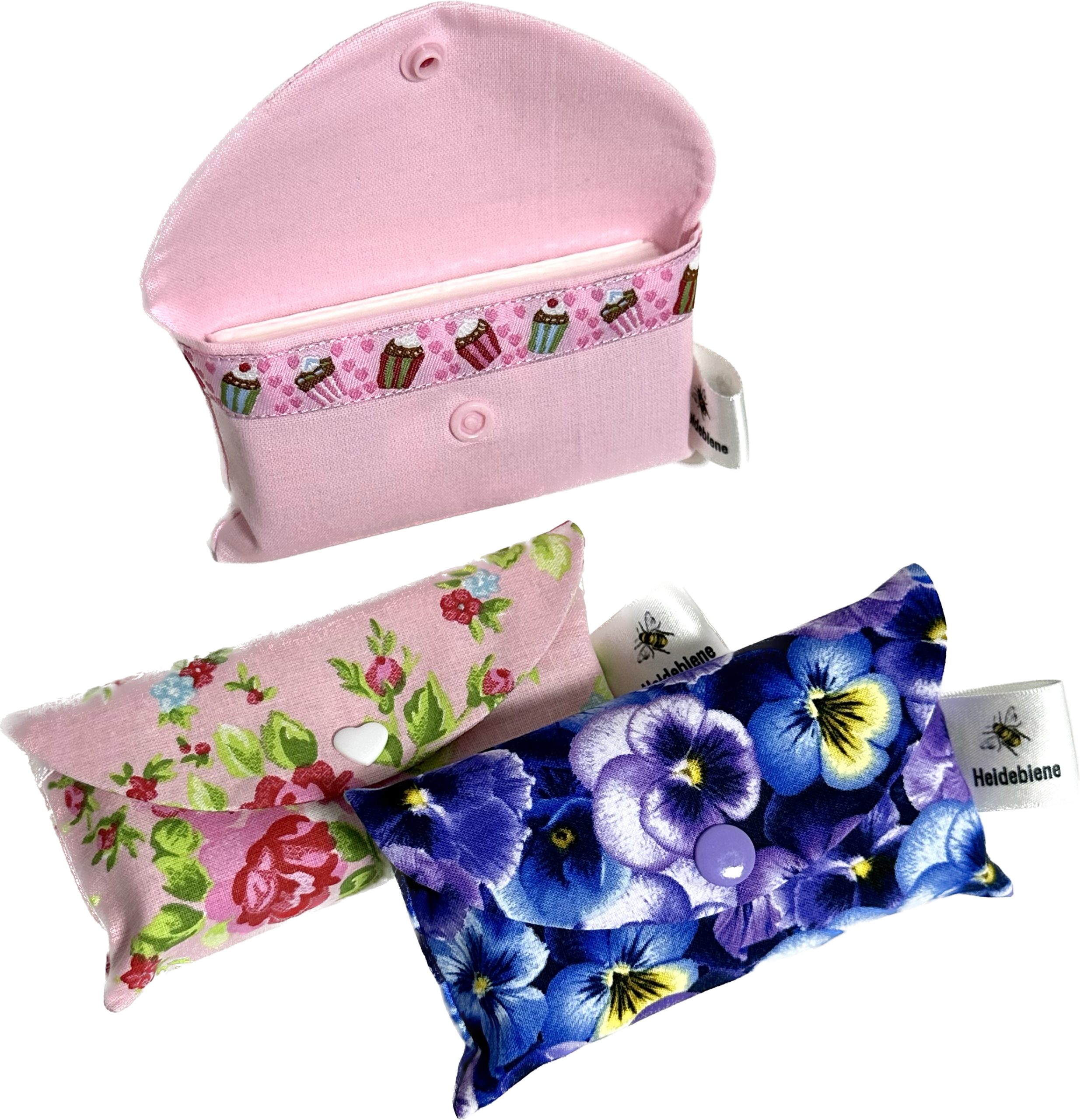 Praktische kleine Tasche/Hülle ideal für Papiertaschentücher. In jedes Modell passt ein ganzes Päckchen Taschentücher. Verschiedene Ausführungen möglich mit Klappverschluss, Druckknopf oder Verschluss mit einer Lasche. Leichte Entnahme eines einzelnen Taschentuches, immer sauber griffbereit aufbewahrt bis zum letzten Taschentuch und hübsch anzusehen. Eine kleine persönliche Stickerei ist bei einigen Modellen möglich, wie die Beispiele zeigen. Die Tasche ist auch geeignet für Hygieneartikel für unterwegs, eine 50g Tafel Schokolade, Ladekabel oder Hundeleckerli u.v.m.  Ein ideales kleines Geschenk als Mitbringsel oder Dankeschön. Weitere Ideen findest du unter Schnäppchen.
