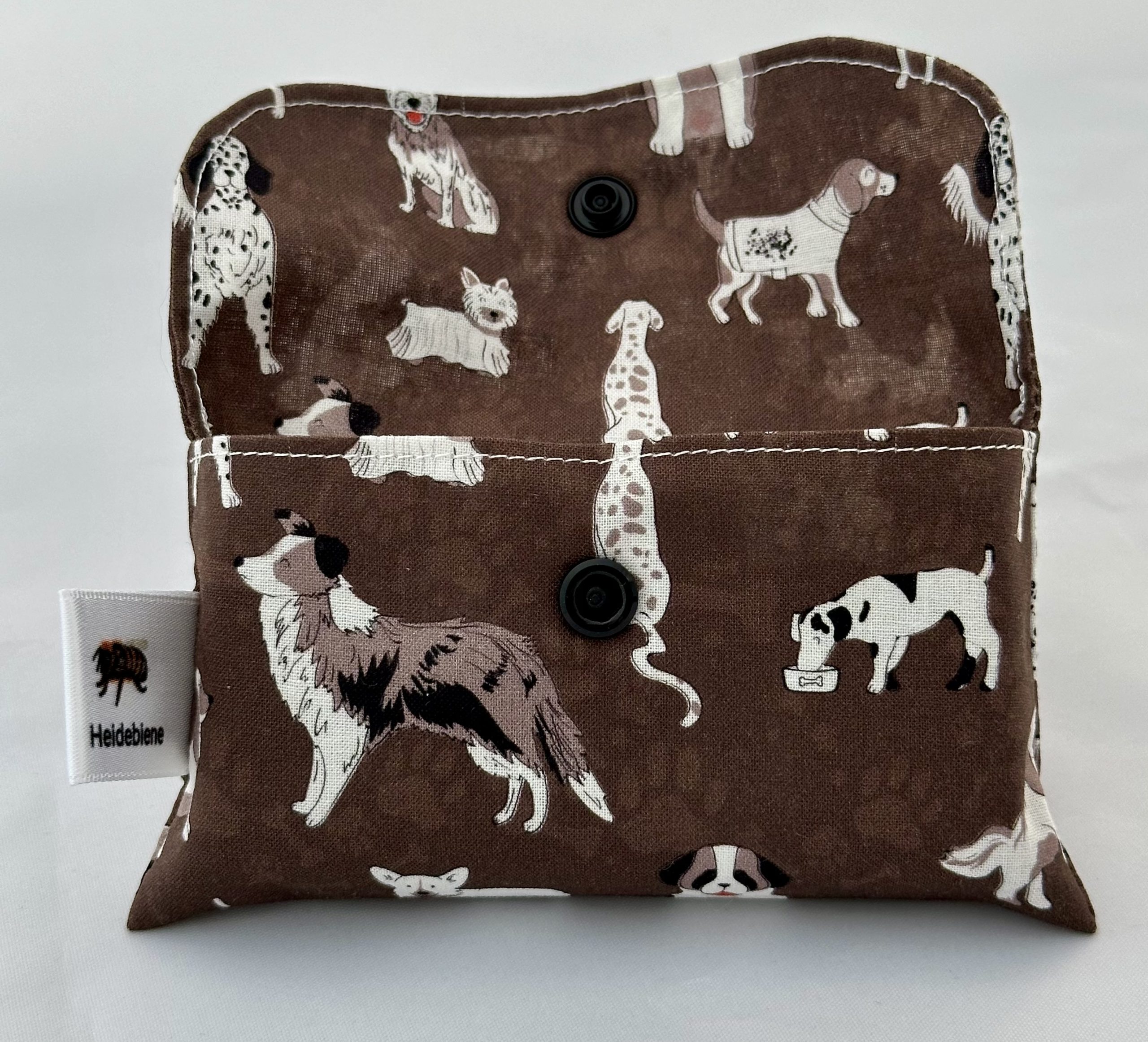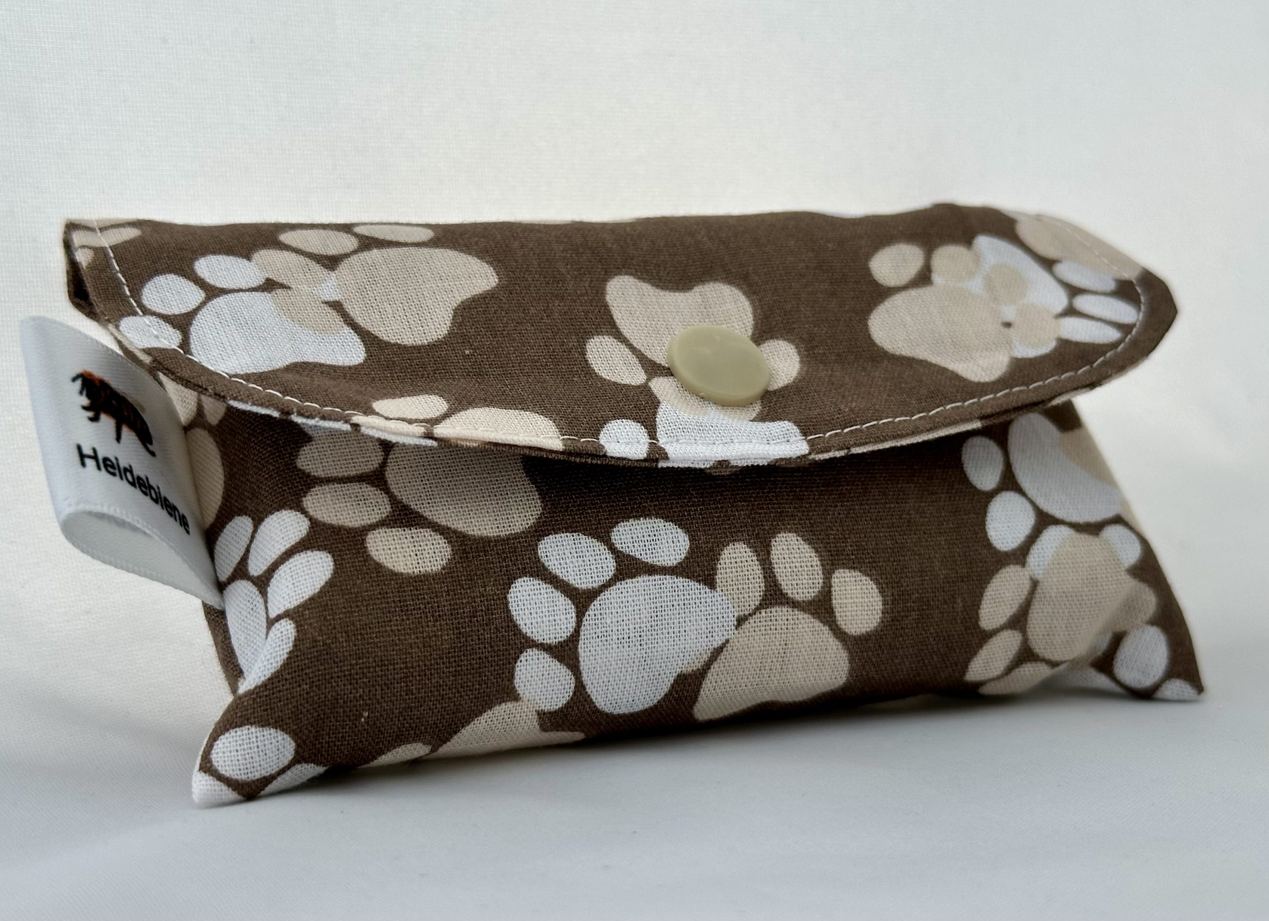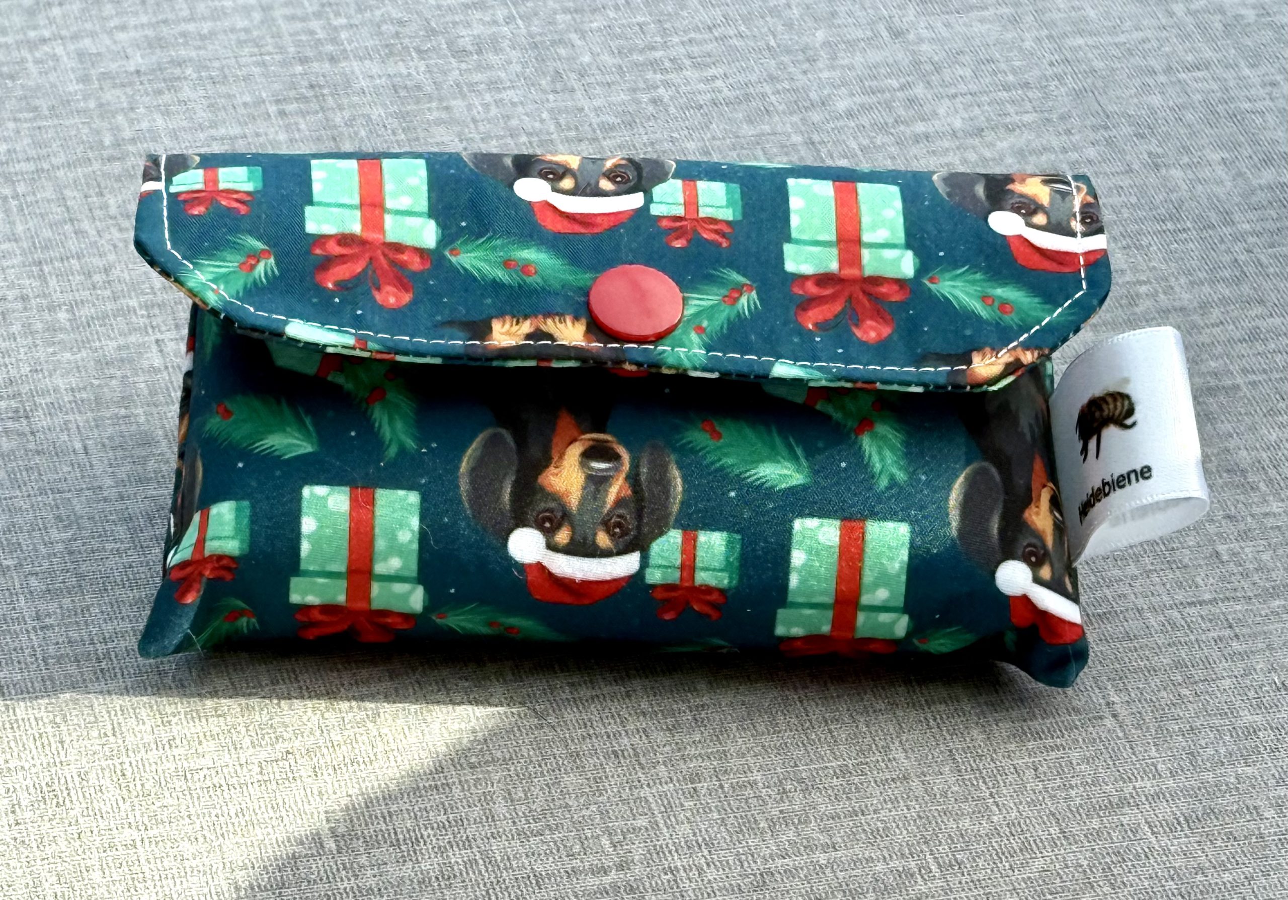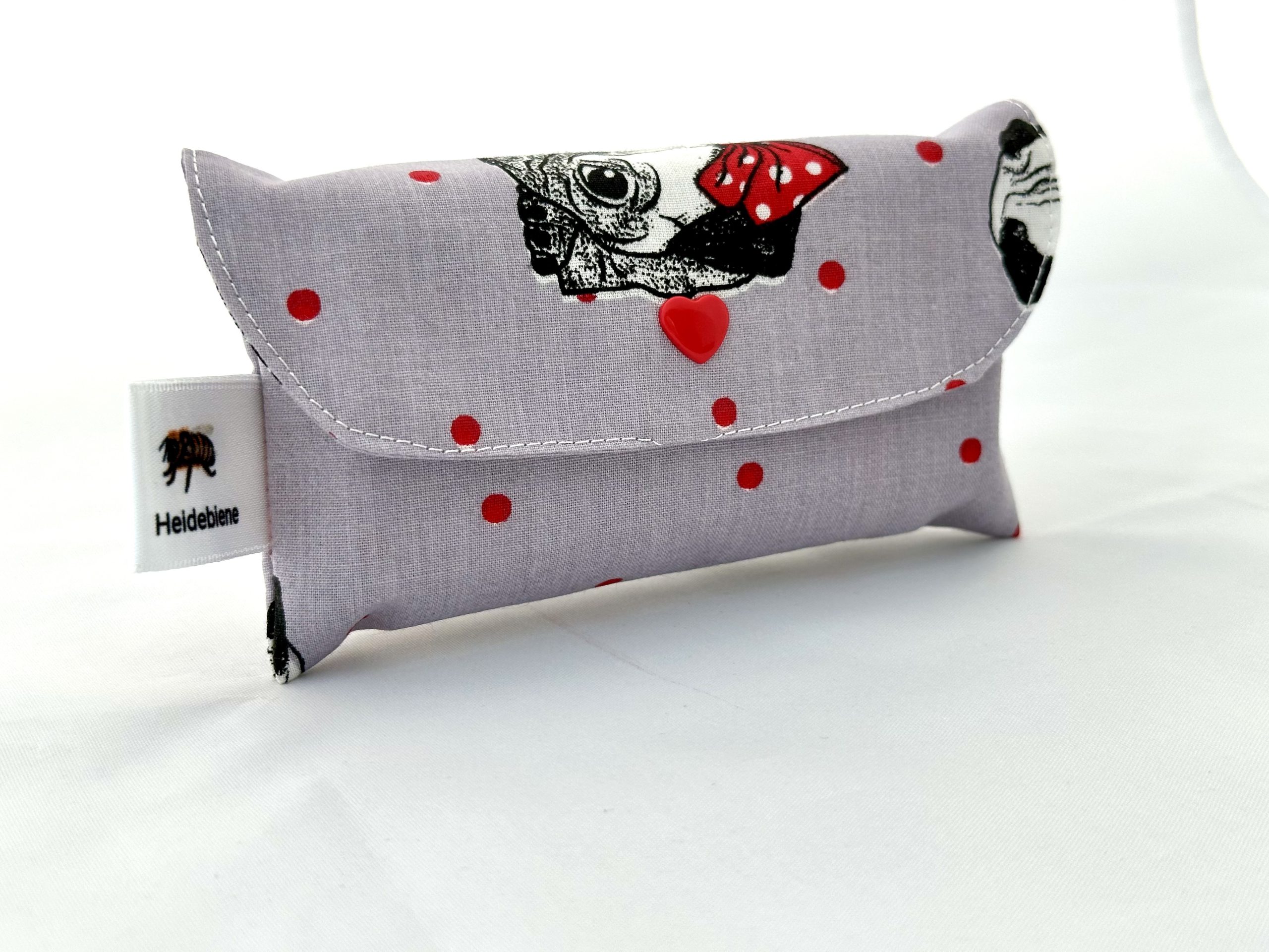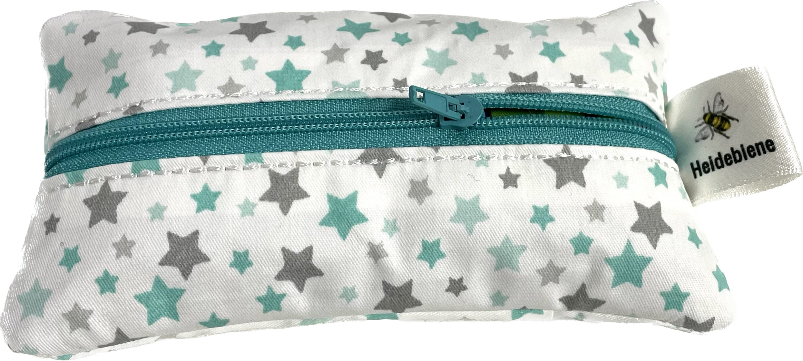 Praktische kleine Tasche/Hülle ideal für Papiertaschentücher. In jedes Modell passt ein ganzes Päckchen Taschentücher. Verschiedene Ausführungen möglich mit Klappverschluss, Druckknopf oder Verschluss mit einer Lasche. Leichte Entnahme eines einzelnen Taschentuches, immer sauber griffbereit aufbewahrt bis zum letzten Taschentuch und hübsch anzusehen. Eine kleine persönliche Stickerei ist bei einigen Modellen möglich, wie die Beispiele zeigen. Die Tasche ist auch geeignet für Hygieneartikel für unterwegs, eine 50g Tafel Schokolade, Ladekabel oder Hundeleckerli u.v.m.  Ein ideales kleines Geschenk als Mitbringsel oder Dankeschön. Weitere Ideen findest du unter Schnäppchen.